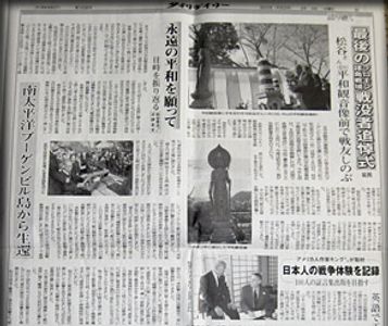 Dan King accepted a rare invitation to attend a ceremony for the Japanese war dead held in Nobeoka, Kyushu. A full page article appeared on Feb. 4, 2010, in the "Yukan Daily"describing the memorial for the Japanese war dead from the Solomon Islands Campaign. The ceremony was conducted by WWII Japanese army veteran Maretsugu Matsutani (86) who survived a severe wound in the battle for Bougainville. He helds the annual ceremony to honor his fallen comrades and pray for world peace." The event was attended by approximately 50 people who were mostly relatives of Japanese army troops who served in the Solomons, or never returned. There were only 4 surviving WWII veterans in attendance. The article was written by Mr. Kozo Sakamoto.