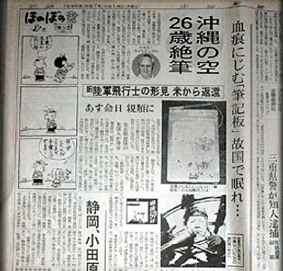 Newspaper articles from the Chuunichi Shinbun regarding the return of a Japanese Army Pilot's logbook by USMC Pilot Capt. Ken Walsh. Medal of Honor recipient Ken Walsh was a member of the infamous "Black Sheep Squadron" under Major Pappy Boyington. During the course of the war, Capt Walsh shot down 21 Japanese planes to be one of the Marine Corps leading aces.