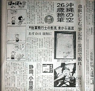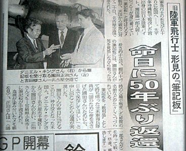Newspaper articles from the Chuunichi Shinbun regarding the return of a Japanese Army Pilot's logbook by USMC Pilot Capt. Ken Walsh. Medal of Honor recipient Ken Walsh was a member of the infamous "Black Sheep Squadron" under Major Pappy Boyington. During the course of the war, Capt Walsh shot down 21 Japanese planes to be one of the Marine Corps leading aces.