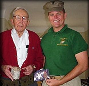 While exploring the jungles of Peleliu with "Military Historical Tours" in March '02 Dan King found a Marine canteen cup named to Joseph A. Odorowski F-2-7 ("F Company, 2nd Battalion, 7th Marine Regiment, 1st Marine Division). At that moment King decided to find the original owner or next-of-kin and return the cup. After returning to California, King miraculously located the former Marine living in Michigan! He flew to Michigan to return the cup and meet this former Marine. King learned that Pfc Odorowski fought with the 1st MarDiv at Cape Gloucester, Peleliu and finally Okinawa where he was shot in the shoulder. Other people who were there when the cup was found on Peleliu were Diane Kuebler, Jim Pilkington, Doug Meny, John Edwards, and Kevin Windsberger.